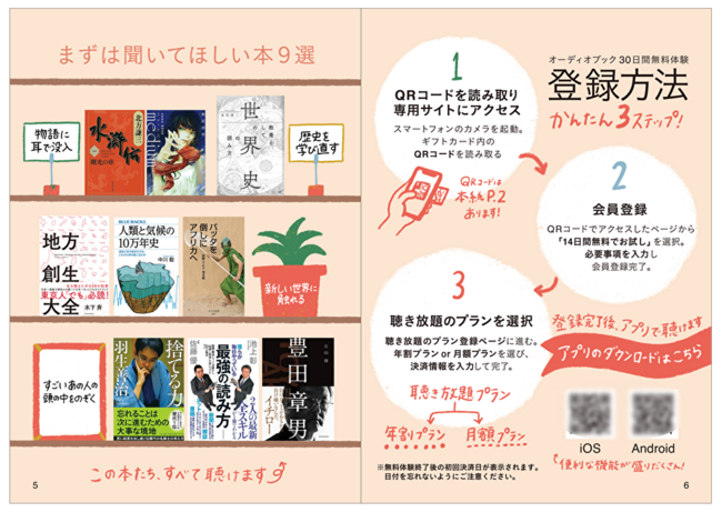 オリジナルのギフトカードを制作し、オーディオブックの世界観を再現。audiobook.jpの利用シーン、おすすめ作品の紹介、オーディオブックの登録方法・利用方法をまとめました。日ごろの思いや感謝の気持ちを書き込めるメッセージ欄も用意しています。