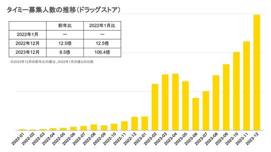 タイミー上のドラッグストアの募集人数が前年比8.5倍、事業所数が前年比6.6倍に急拡大