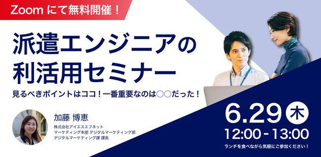 ITインフラソリューションを中心に、クラウド環境や、ネットワークシステムの構築・保守・運用におけるサービスを提供する、株式会社アイエスエフネット(本社:東京都港区、代表取締役:渡邉幸義、社員数:2,475名)は、2023年6月29日(木)の日程にて、派遣エンジニアの利活用セミナーを開催いたします。