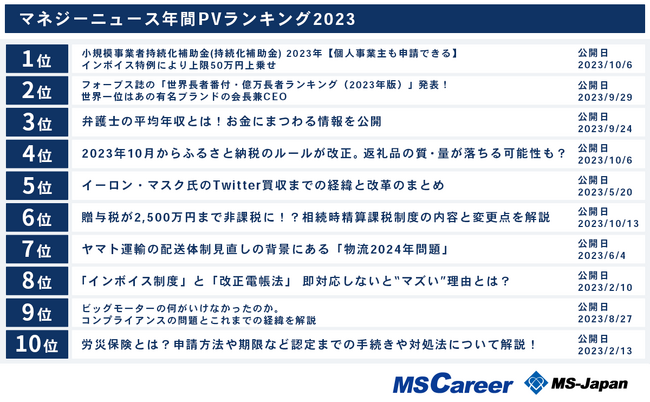 株式会社MS-Japan(本社:東京都千代田区 代表取締役会長兼社長CEO:有本隆浩/以下MS-Japan 証券コード:6539)が運営する、管理部門・士業の総合転職サービス「MS Career(エムエスキャリア)」は、「マネジーニュース年間ランキング2023」を発表しましたので、お知らせいたします。本調査は、管理部門・士業のためのビジネスメディア「Manegy(マネジー)」にて2023年1月~2023年11月のニュース記事を対象に実施いたしました。