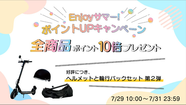 楽天市場「Show !t」は7月29日(金)10時から、MEISTER.F電動キックボードをご購入すると、大好評の購入後届いたらすぐにキックボードがある生活を始められるヘルメットと輪行バックセットのプレゼントキャンペーン第2弾を実施します。キックボードを取り入れて、普段の生活での移動をもっと楽しくより快適にしましょう。また、7月29日(金)10時~7月31日(日)23時59分まで開催される楽天サマーポイントアップに参加し、、全商品ポイント10倍プレゼントを実施します。