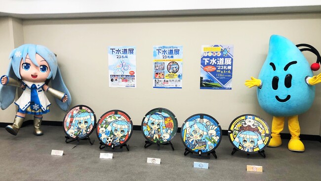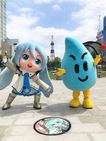 このたび、2023年8月に初めて札幌市で開催される「下水道展’23札幌」を記念して制作するデザインマンホール蓋に、両キャラクターを起用していただきました。札幌市下水道のマンホールにキャラクターが起用されるのは、今回が初めてのことです。2023年7月7日(金)に大通西4丁目で行われた報道発表会には、代表で『雪ミク』が出席。札幌市下水道キャラクター『クリンちゃん』と一緒にマンホール蓋の設置に立ち会ったほか、記念のフォトセッションにも応えました。