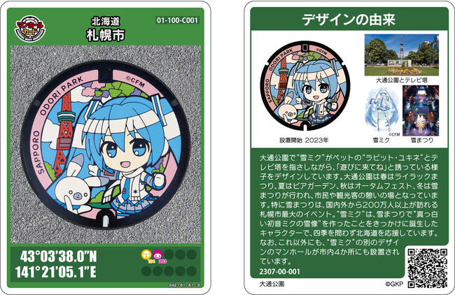 クリプトン・フューチャー・メディア株式会社(本社:北海道札幌市、代表取締役:伊藤博之、以下クリプトン)が展開する北海道を応援するキャラクター『雪ミク(初音ミク)』と『ラビット・ユキネ』のデザインマンホール蓋が、札幌市内5ヶ所に設置されました。2023年7月7日(金)に大通西4丁目で行われた報道発表会では『雪ミク』と札幌市下水道のキャラクター『クリンちゃん』が登場し、札幌市下水道初となるキャラクターを活用したマンホール蓋の設置を祝いました。