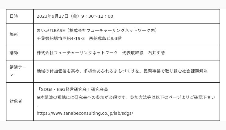 株式会社フューチャーリンクネットワーク(本社:千葉県船橋市)の代表取締役 石井丈晴は、株式会社タナベコンサルティング(本社:東京都千代田区、代表取締役社長:若松孝彦)が主催する「第4期 SDGs・ESG経営研究会」の第1回(2023年9月27日(水)開催)に講師としてに登壇し、当社のビジネスモデルと社会課題解決×ビジネスの両立について講演いたします。