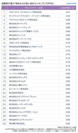 「退職者が選ぶ「辞めたけど良い会社ランキング」【中小ベンチャー企業編】」とは、OpenWork に投稿された社員クチコミのうち、従業員数が300人未満の企業の退職者による評価に限定し、退職者からの評価が高い企業を集計したランキングです。