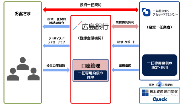 当サービスは、主に個人のお客さまを対象とした投資一任運用サービスです。当社がお客さまとの間で投資一任契約を締結し、広島銀行がアドバイザーとして、お客さまに対してゴールベースアプローチに基づくライフプランアドバイス並びに継続的なフォローアップを行います。また、お客さまの契約資産は広島銀行の投資信託口座で管理されます。なお、サービス運営に係る事務・システムについては、ゴールベース型の資産運用アドバイスサービスに深い知見・経験を有する株式会社日本資産運用基盤グループおよび株式会社QUICKと連携します。