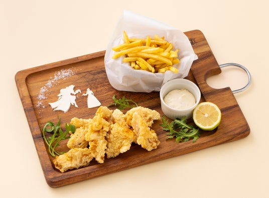 舞台であるイギリス発祥の「フィッシュアンドチップス」。サクサクにフライした白身魚とフライドポテトをタルタルソースを添えて提供します。