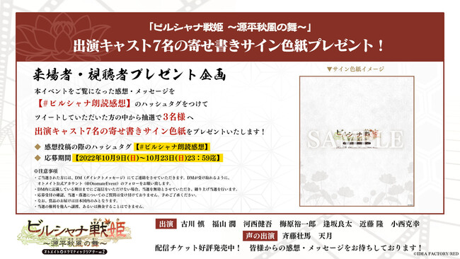 本イベントをご覧になった感想・メッセージを【#ビルシャナ朗読感想】のハッシュタグをつけてツイートしていただいた方の中から抽選で3名様へ出演キャスト7名の寄せ書きサイン色紙をプレゼントいたします。