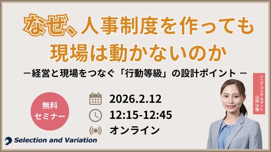 組織・人事コンサルティングファームであるセレクションアンドバリエーション株式会社(以下、当社、東京都千代田区丸の内、大阪市西区、名古屋市西区 / 代表取締役社長:平康慶浩/ URL:https://sele-vari.co.jp/ )は『なぜ、人事制度を作っても現場は動かないのか ― 経営と現場をつなぐ「行動等級」の設計ポイント ―』セミナーを2026年2月12日(木)12:15~12:45に開催することをお知らせいたします。