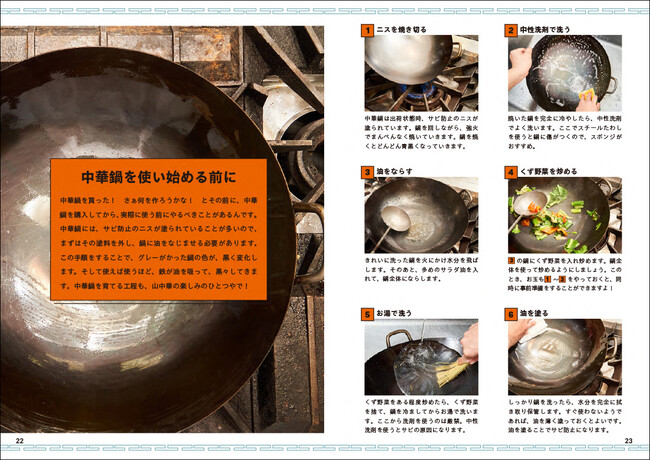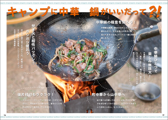 シーズニングをはじめとする中華鍋の使い方もしっかり解説しているので、はじめてでも大丈夫。さらに、キャンプ場での調理をスムーズにするための家での準備も丁寧に解説しています。