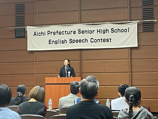 今大会へは愛知県内の各地区予選で計77名から選抜された13名の高校生が出場しました。演説後の質疑応答では、審査員から「あなたと同世代の子どもたちが情熱を持つために学校はどのようなサポートができると思いますか。」という質問が上がりました。これに対し「私の通う国際高等学校では、各教科の先生方が幅広い知識と高い専門性を持っているので、個々の生徒の興味や知りたい内容に合わせてアドバイスや情報をもらうことができます。こういった環境を提供することで、生徒は興味を持つ学問分野や学部についてより深く知ることができ、将来につながる情熱を追求することが可能になると思います。」と答えました。