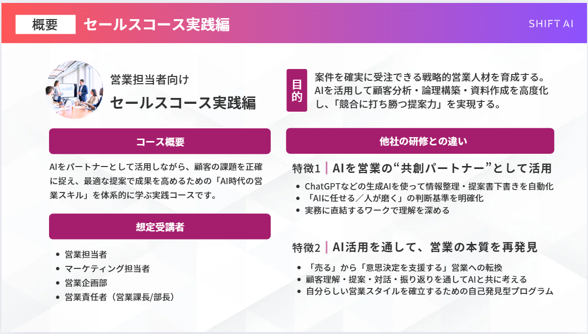 「日本をAI先進国に」を掲げ、AIのビジネス活用が学べる利用者数No.1※の生成AI学習コミュニティ「SHIFT AI」を運営する株式会社SHIFT AI(東京都渋谷区、代表取締役 木内翔大、以下当社)は、法人向けリスキリングサービス「SHIFT AI for Biz」のeラーニングプラットフォームにて、2026年1月20日より新コンテンツ「セールスコース実践編」を配信開始します。本コースは、AIを単なる業務効率化ツールとして使うフェーズから、思考を深めるパートナーとして活用するフェーズへのステップアップを目指した内容です。顧客の経営情報を深く読み解き、決裁者を納得させる論理的な提案書を作成するなど、成約率を高めるための実践的なスキルを体系的に学習します。
