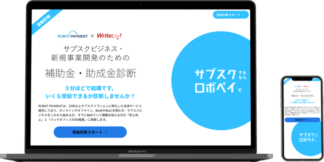 株式会社ROBOT PAYMENT(本社:東京都渋谷区、代表取締役:清久 健也、以下ROBOT PAYMENT)は、サブスクリプションの新規事業を行う企業を対象に補助金・助成金制度の活用を支援するため「サブスクビジネス・新規事業開発のための補助金・助成金自動診断サイト」を開設いたしました。