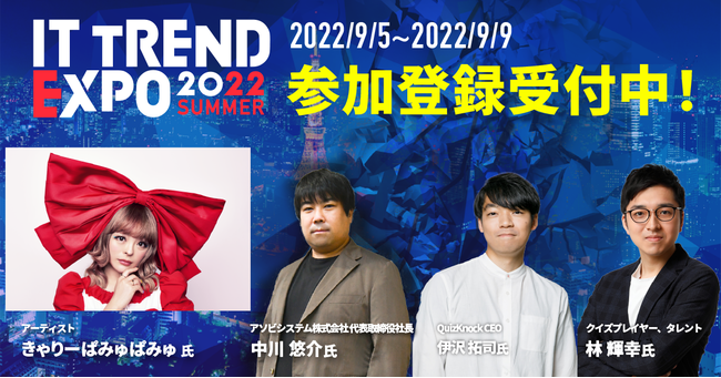 株式会社イノベーション(東証グロース 証券コード3970)のグループ会社である、株式会社Innovation & Co.(本社:東京都渋谷区、代表取締役社長:齊藤和馬、以下「Innovation & Co.」)は、第6回目の開催となる業界最大級のオンライン展示会「ITトレンドEXPO2022 Summer」を、2022年9月5日(月)~ 9月9日(金)に開催。豪華登壇ゲスト第3弾として、「青文字系カルチャー」の代名詞 きゃりーぱみゅぱみゅ氏や生みの親である中川氏、クイズ業界を牽引する伊沢氏・林氏が決定しましたことをお知らせします。
