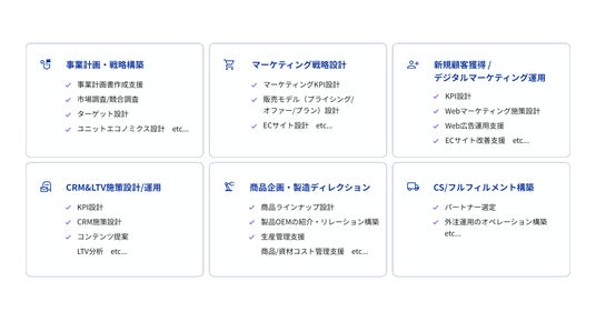 事業戦略の設計やマーケティング施策の戦略立案・運用、ブランドの立ち上げからグロースまで、ビジネスの上流から下流の各フェーズに応じた伴走型の支援体制。