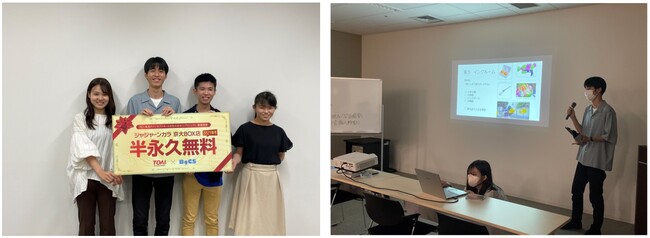 最優秀チームとして選ばれたメンバー全員に「ジャジャーンカラ京大BOX店」の『半永久無料券』(2221年まで歌い放題!)を賞品としてお渡しさせていただきました。今回提案されたコンセプトルームに関しては今後、ジャンカラ店舗での導入も検討していきます。
