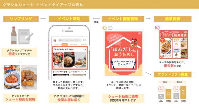 今回新たに提供を開始した「クラシルショート イベントタイアップ」は、「クラシル」のweb・アプリでショート動画を発信しているクリエイターに商品プレゼントを行い、テーマに沿ったレシピのショート動画の投稿を促し、投稿された動画を「クラシル」に掲載します。