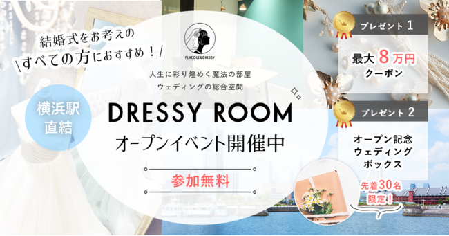 花嫁アプリ「PLACOLE & DRESSY」を運営する、冒険社プラコレ(本社:神奈川県鎌倉市、代表取締役CEO:武藤功樹)は、横浜駅直結JR横浜タワー21Fに ウェディングの魔法にかかる空間"DRESSY ROOM YOKOHAMA"のオープンしたことをお知らせいたします。