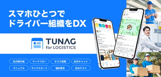 「TUNAG for LOGISTICS」は、物流企業向けのDXサービスです。スマートフォンひとつで、ドライバーを含む組織全体のデジタル化を実現します。「情報共有」「申請・報告」「人材育成」「社内交流」など、組織の課題を解決する豊富な機能を備え、物流企業の安定した強固な組織づくりに貢献してきました。