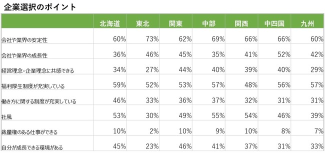 2.「会社や業界の安定性」は全エリア共通のキーワード