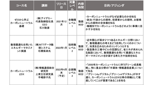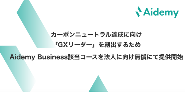 AIを中心としたDX人材の育成から実運用まで一気通貫で支援する株式会社アイデミー(本社:東京都千代田区、代表取締役執行役員社長CEO 石川聡彦、以下「アイデミー」)は、2022年4月7日よりカーボンニュートラル達成に向け「GXリーダー」創出のため、Aidemy Businessの該当コースを無償にて提供開始します。