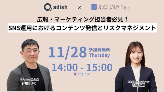 デジタルエコノミー特化のカスタマーサクセスソリューション・プロバイダーであるアディッシュ株式会社(本社:東京都品川区、代表取締役 江戸 浩樹、証券コード:7093、以下 アディッシュ)は、PR発想であらゆるコミュニケーション活動を支援する株式会社プラップジャパンと共催による「SNS運用におけるコンテンツ発信とリスクマネジメント」ウェビナーを、2024年11月28日(木)に開催します。