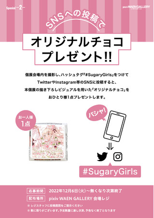 会場内を撮影し、ハッシュタグ『#SugaryGirls』をつけてTwitterやInstagram等のSNSに投稿いただいた方に、本個展の描き下ろしビジュアルを用いたオリジナルチョコ(全1種)をおひとり様につき1点プレゼントします。