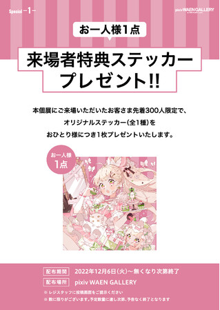 本個展にご来場いただいたお客さま先着300人限定で、オリジナルステッカー(全1種)をおひとり様につき1枚プレゼントいたします。