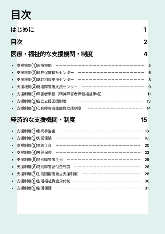 本資料では、うつ病のある人が利用できる主な支援機関や支援制度をわかりやすく整理しました。