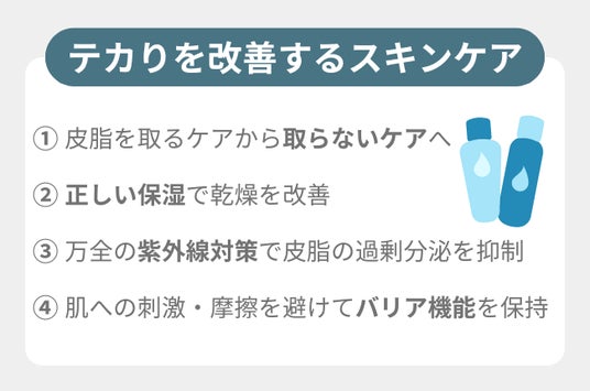 テカリを改善するには「スキンケア」と「生活習慣」の見直しが大切です。