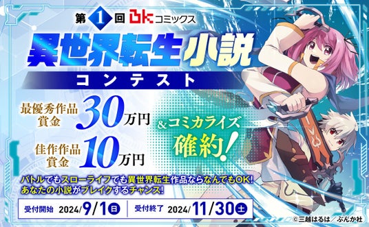 株式会社ぶんか社(本社:東京都千代田区、代表取締役:今晴美)の男性向けライトノベルのコミカライズレーベル「BKコミックス」は、コンテンツプロデュースを行う株式会社ビーグリーが運営する小説投稿サービス『ノベルバ』( https://novelba.com/ )と共同で「第1回BKコミックス異世界転生小説コンテスト」を2024年9月1日(日)より開催いたしましたのでお知らせいたします。