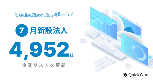 「データとテクノロジーで、ビジネスを加速させる。」をミッションに掲げ、日本全国約510万社の企業データを基盤に営業の効率化を支援する「SalesNow」を展開してきた株式会社QuickWork(本社:東京都渋谷区、代表取締役:村岡 功規、以下「QuickWork」)は、日本全国約510万社の企業情報を網羅した日本最大級のデータベースを誇る「SalesNow DB」において、7月新設法人4,952社の情報を更新したことをお知らせします。