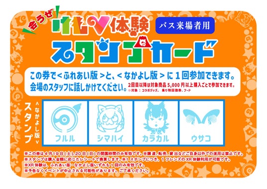 ※ バスツアー参加者には会うぜけもV体験<バス来場者用>スタンプカードを、乗り物チケット2回券購入者には会うぜけもV体験<一般来場者用>スタンプカードを、それぞれお渡しします。