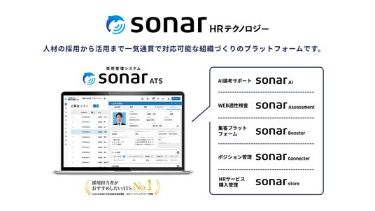 「sonar HRテクノロジー」は、人材の採用から活躍まで一気通貫で対応可能な組織づくりのプラットフォームです。その中心となる採用管理システム「sonar ATS」は、採用業務のデジタル化を通じて、各種オペレーションの自動化や、データ分析による効率化を実現。採用担当者の業務負荷を大幅に削減します。2012年よりサービス提供を開始し、株式会社NTTデータグループ、全日本空輸株式会社、ダイキン工業株式会社、トヨタ自動車株式会社、法務省、文部科学省、LINEヤフー株式会社など、2,200社を超える企業や官公庁に利用されています。