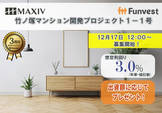 「未来をわかちあう投資」を提供する「Funvest(ファンベスト)」(以下、Funvest)は、「MAXIV 竹ノ塚マンション開発プロジェクト1-1号」(以下、本ファンド)の募集を12/17より開始しますので、お知らせいたします。