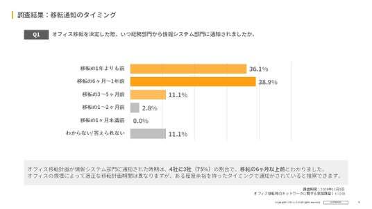 1)オフィス移転が情報システム部門に通知された時期は、移転の6か月以上前と約75%が回答