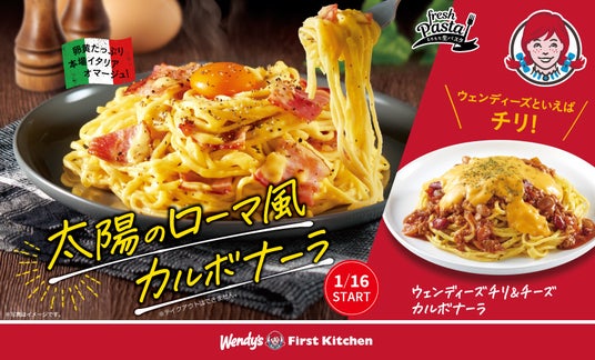 ウェンディーズ・ジャパン株式会社及び、ファーストキッチン株式会社 (所在地:東京都新宿区、代表取締役:紫関修) では、1月16日(木)から、ウェンディーズ・ファーストキッチンとファーストキッチン(※一部店舗を除く)にて、本場イタリアのカルボナーラをオマージュした「太陽のローマ風カルボナーラ」など、3つの新商品を発売します。ファーストキッチンは本格的な生パスタを手軽に楽しめるハンバーガーチェーンで、2005年に販売をスタートしてから20年、女性のお客様を中心に親しまれてきました。今回の新商品のパスタソースは、本場イタリアのカルボナーラソースに習い、生クリームを使用せず卵黄とブラックペッパーを効かせた本格的なパスタソースに仕立てました。「太陽のローマ風カルボナーラ」はウェンディーズとファーストキッチンどちらの店舗でもお楽しみいただけます。また、本場アメリカで親しまれており日本でも大人気のチリをトッピングした、ウェンディーズ店舗限定「ウェンディーズ チリ&チーズカルボナーラ」や、ファーストキッチン店舗限定で「本気(ガチ)モッツァレラチーズのカルボナーラ」をご用意しました。ぜひ、年月とともに成長してきたこだわりの生パスタをお楽しみください。