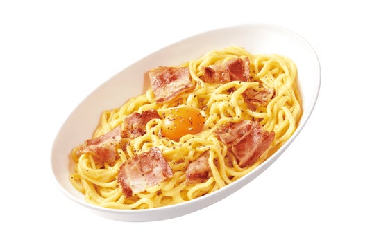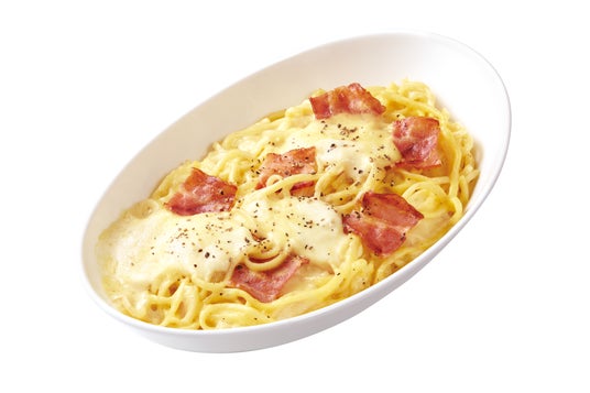 本場イタリアのカルボナーラソースを参考に、生クリーム不使用で卵黄たっぷりの本格的なカルボナーラに仕立てました。ベーコンをふんだんに使用し、ブラックペッパーを効かせた満足感のあるごちそうカルボナーラは、他社チェーンにはない唯一無二のパスタです。