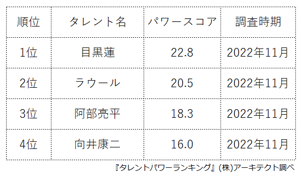 本ランキングは、2022年11月度に実施したタレント調査データ(一部過去実施データ)を利用し、タイトルに応じてランキング形式でまとめたものです。