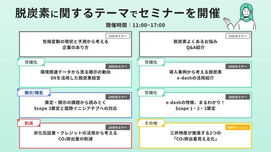 当社ブースでは、パネル展示やセミナーにて、CO2排出量の可視化から削減まで一気通貫で支援する「e-dash」のサービス概要や、企業の導入事例、パートナーや金融機関、自治体と連携した様々な取り組みなどをご紹介します。