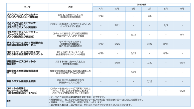 本セミナーでは、ロボットの開発や利活用の両側面に関連するプログラムをご用意。特に、ロボット設計やロボットを用いたサービスの開発において最初のステップとなるリスクアセスメントについては、「概要編」「実施編」「リスク低減策及び検証編」の3部構成でご案内いたします。ご興味のある方は、ぜひご参加ください。