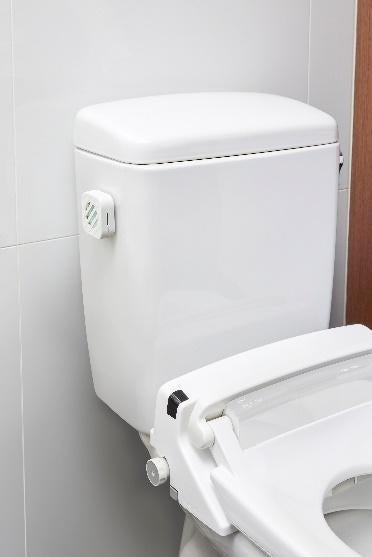 本体容器(右画像)は、トイレ空間への溶け込みを重視したミニマルなデザイン。本体の側面の窓から液体が見え、交換時期が分かるように設計されており、空間に馴染むよう正面からは液色が見えない仕様にしています。