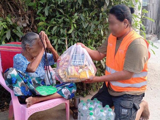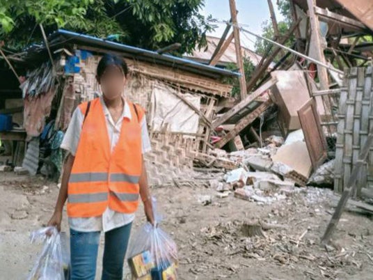 被災者に食料や水を手渡すAARの現地協力団体職員=ミャンマー中部マンダレー地域で2025年4月2日