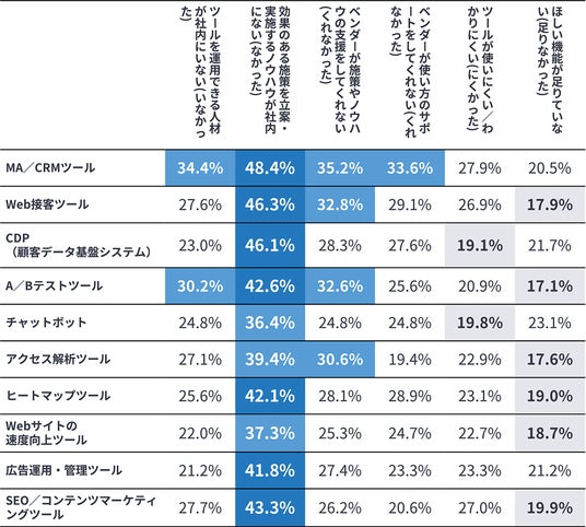 マーケティングツールの運用で抱えている課題を質問したところ、すべてのマーケティングツールで最も課題視されていたのは、「効果のある施策を立案・実施するノウハウが社内にない(なかった)」ことでした。10種類中7種類のマーケティングツールで、40%以上の回答を集めています。