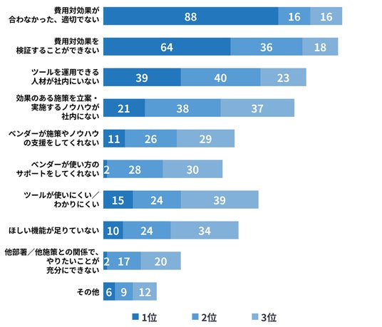 最も回答が集まったのは当然のことながら「費用対効果が合わなかった、適切でない」です。加えて注目すべきなのは2番目に回答の多かった「費用対効果を検証することができない」。マーケティングのDXが叫ばれ始めた当初は、ツールを導入することがゴールになっている企業が少なくありませんでした。ブームが落着き、マーケティングツールに対して冷静に費用対効果を見極めようとする企業が増加していることがわかります。