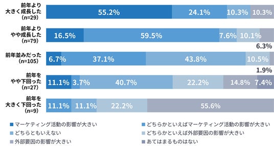 - 売り上げ成長にはマーケティング活動が大きな影響を与えており、「前年より大きく成長した」と回答した人のうち、55.2%が「マーケティング活動の影響が大きい」と回答。