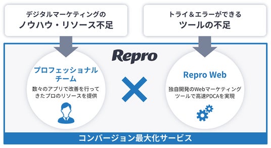 「コンバージョン最大化サービス」は、サイト改修不要で施策を実施できるデジタル接客ツール「Repro Web」と豊富な経験、高いスキルを持ったプロフェッショナルチームをセットで提供し、デジタルマーケティングの2大課題である「人材・ノウハウ」「ツール」の不足を一挙に解決するソリューションです。顧客コミュニケーションの改善と売上拡大を支援します。