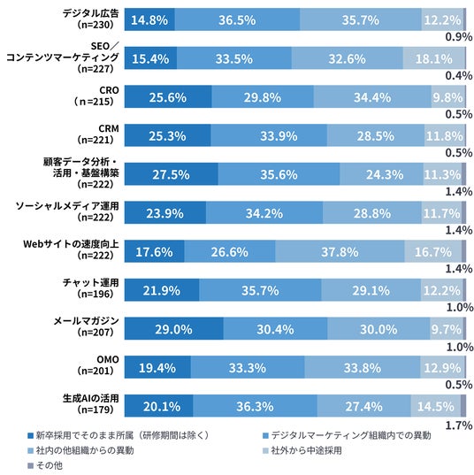 ※「Q10 担当領域の事業・サービスのデジタルマーケティング活動についてお聞きします。デジタルマーケティングの各領域における自社内の担当者の経歴についてお教えください。」に対する回答結果。