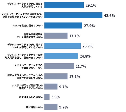 - デジタルマーケティングの課題は「人材」「マーケティングツール」に集中。「デジタルマーケティングの知識があり、施策を実施できるメンバーが足りない」が42.6%と、特に知識・ノウハウ不足に対する課題感が強い。