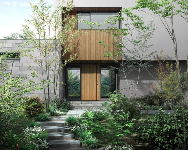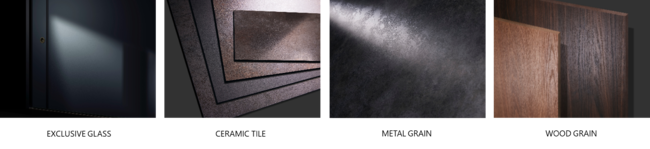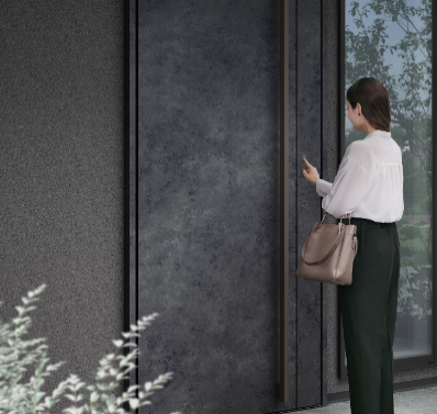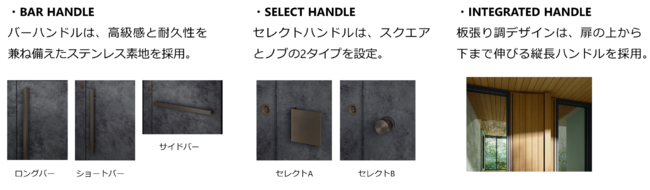 玄関ドアの表面材には、風景を身に纏うように映し出す[EXCLUSIVE GLASS(ガラス)]、焼き物ならではの素材美を活かした[CERAMIC TILE(タイル)]、金属の無機質な風合いを再現した[METAL GRAIN(金属調)]、 天然木さながらの質感を表現した[WOOD GRAIN(木目調)]の4つの素材をラインアップしています。バーハンドル・セレクトハンドルは、ドアのデザイン・素材美が引き立つノイズレスで高級感溢れる仕上げにこだわり、ドアと調和しながら上質な佇まいを演出します。板張り調デザインには扉の上から下まで伸びる縦長ハンドルを採用しました。